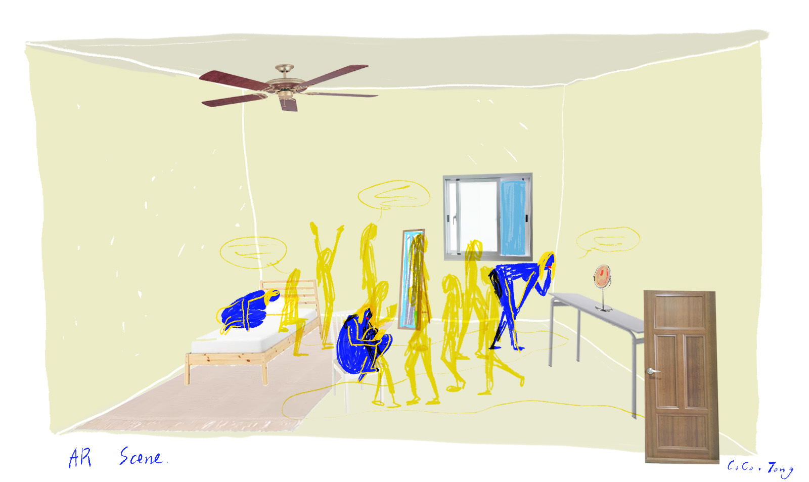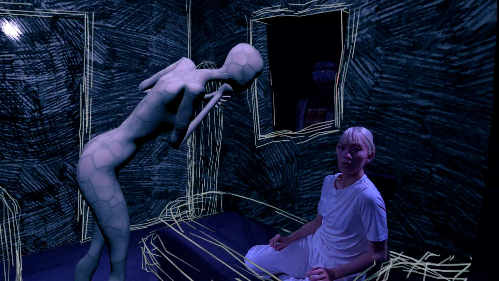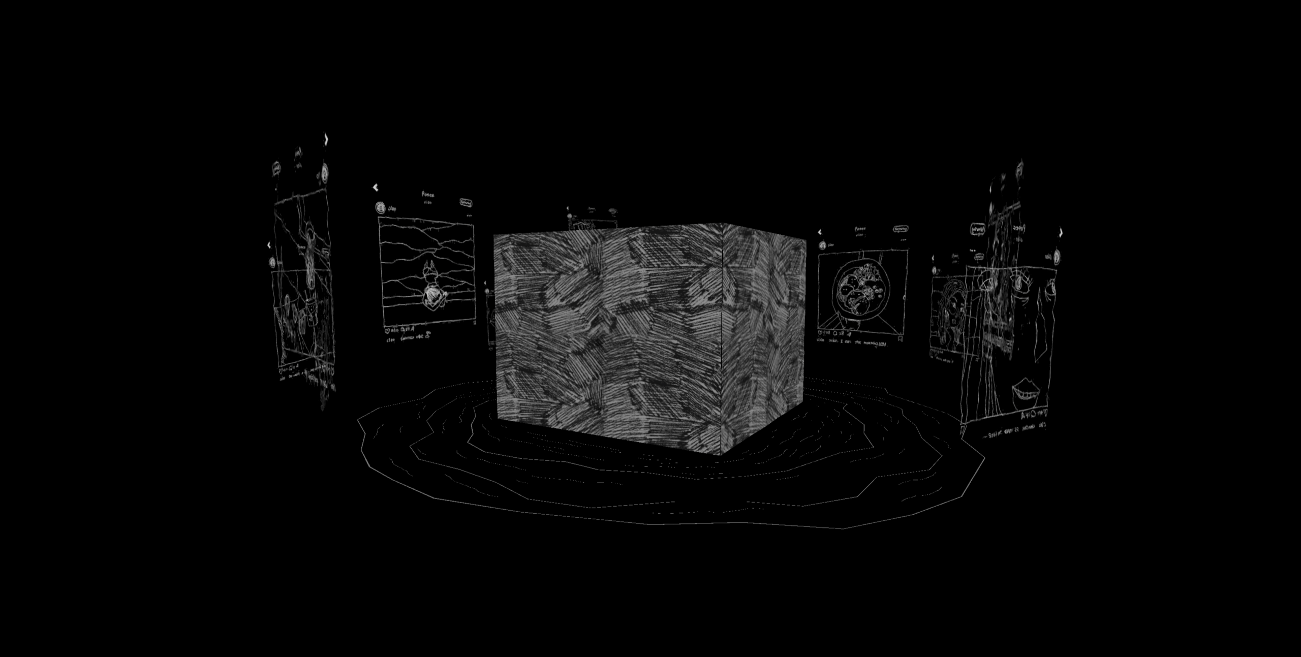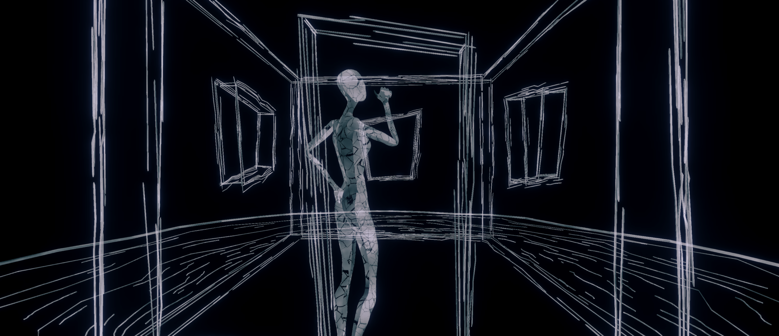 Inspired by Agnès Varda’s 1962 classic Cléo from 5 to 7, which reveals a protagonist’s awakening to how the gaze of others shapes self-perception, Cléo repositions this inquiry within today’s digital landscape. In this MR environment, the live dancer embodies Cléo, engaging in a dialogue with a “virtual avatar.” This avatar functions as an idealized self—much like a social media persona—that responds to, mimics, or even resists the dancer’s real-time movements. Visually, Cléo departs from photorealism and adopts a hand-drawn aesthetic marked by raw lines and expressive abstraction—evoking the messy urgency of personal journaling. The visual world mirrors the instability of the protagonist’s inner world, colliding real and virtual elements to express the constant negotiation between vulnerability and performance.